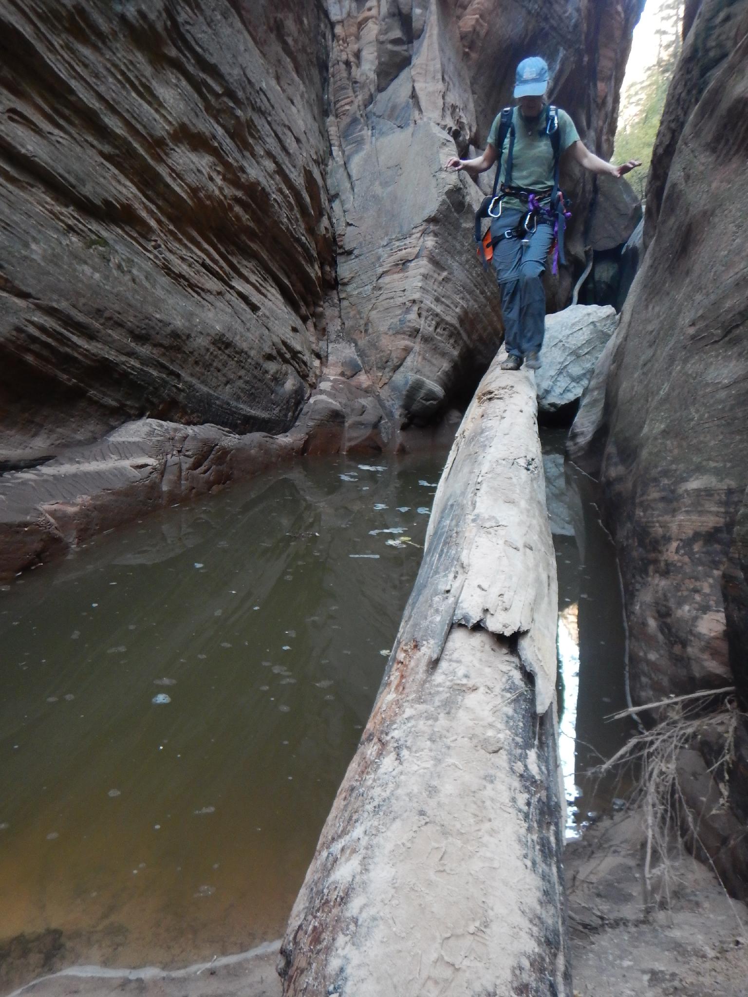 Diane doing the log walk on one of the lower obstacles in Hidden Canyon