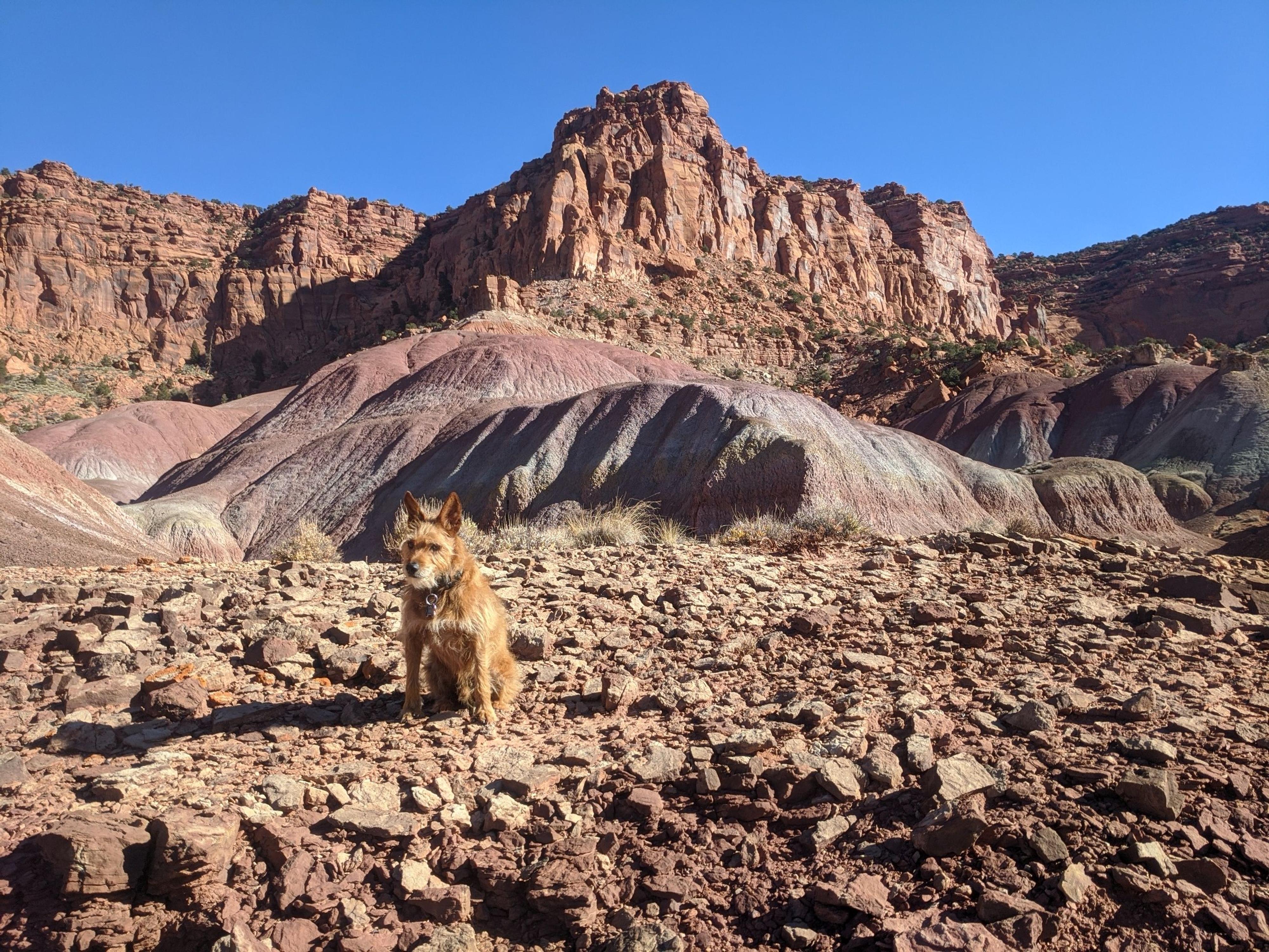 Colorful hills and happy dog towards end of canyon.