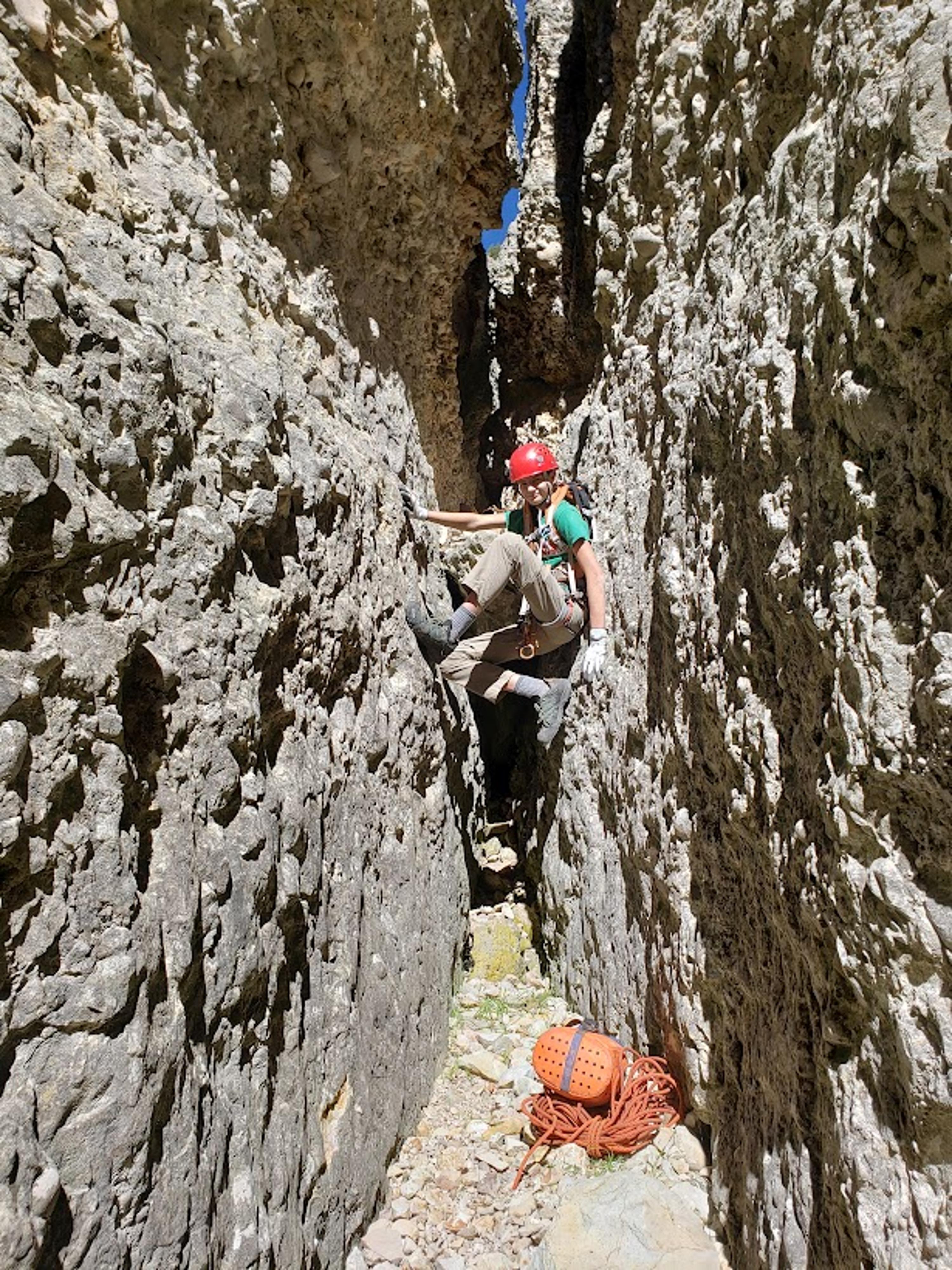 Trevor downclimbing a short drop.