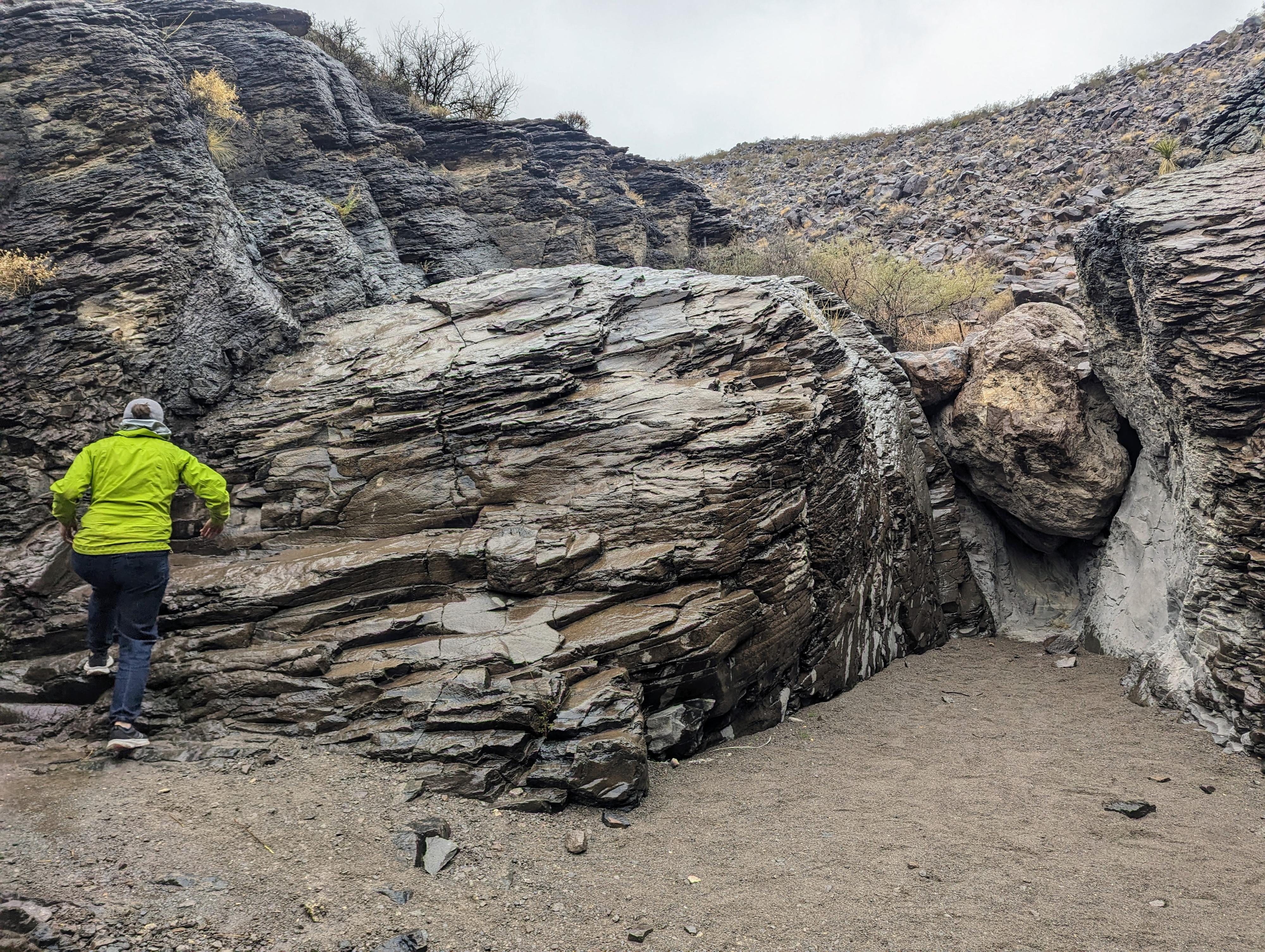 Diane climbing around the most difficult obstacle. Still an easy climb around for most.