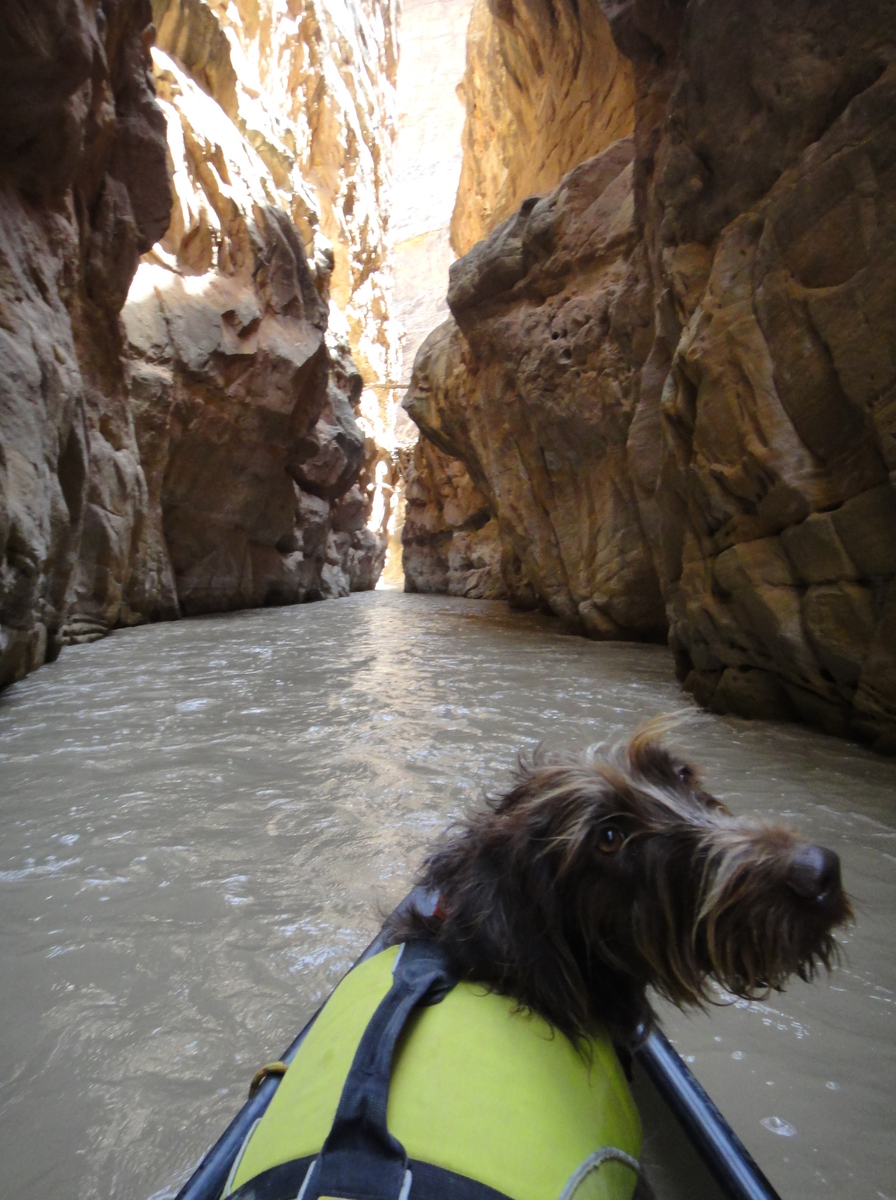 Lucy wondering if we will fit - The Chute of Muddy Creek - San Rafael Swell