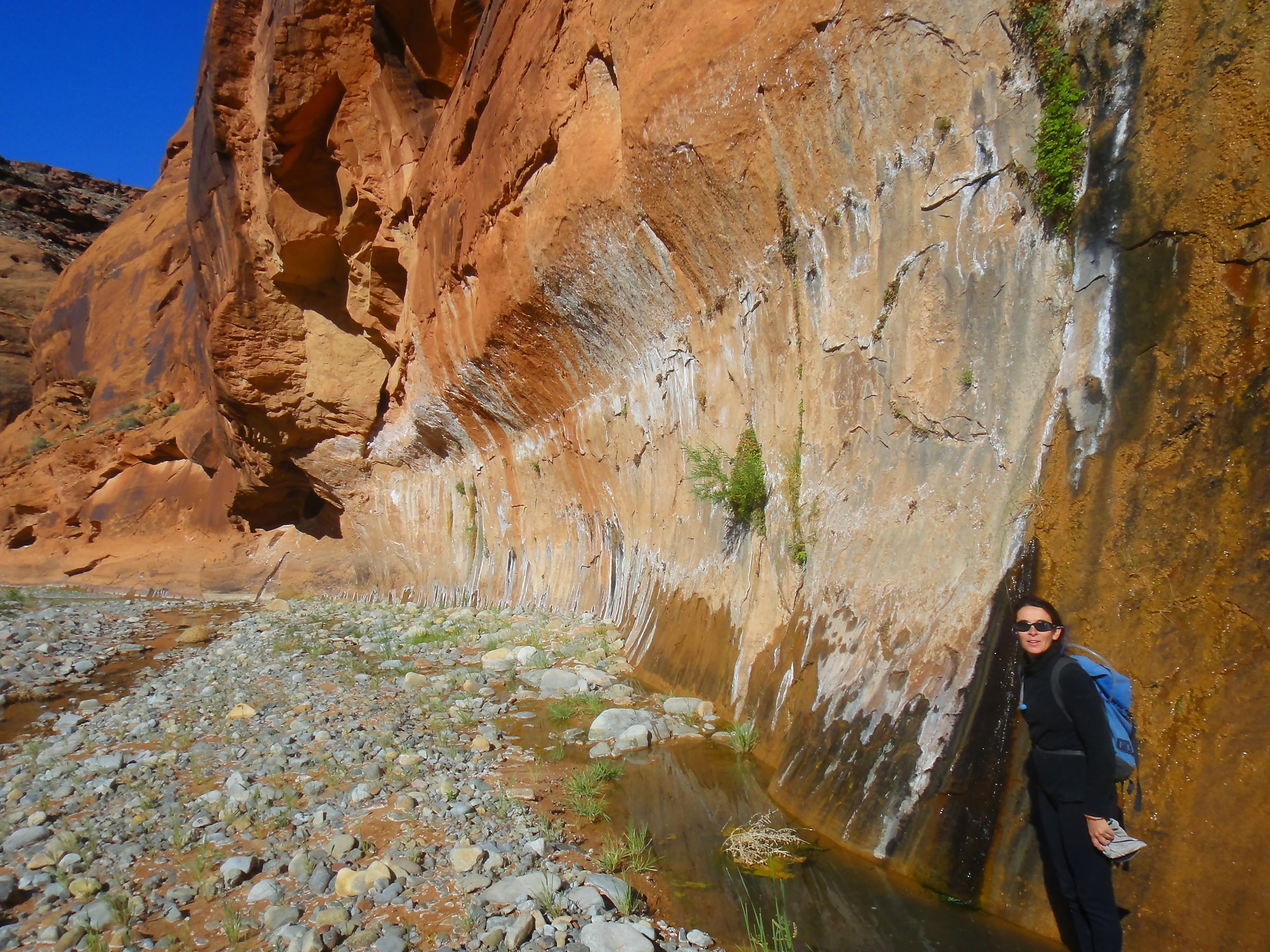Cristina along a seeping wall in Lower Trachyte