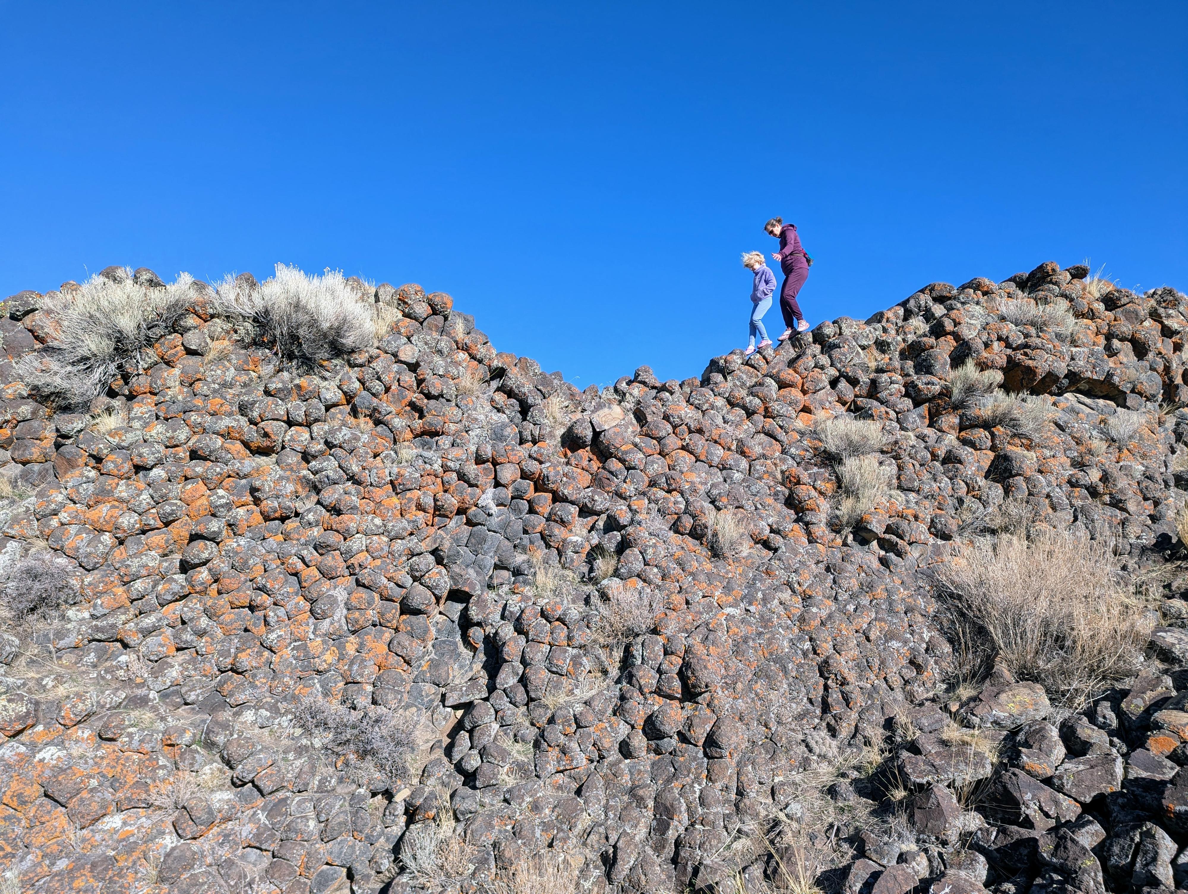 Carefully walking on the woodpile. It is a pretty dramatic place.