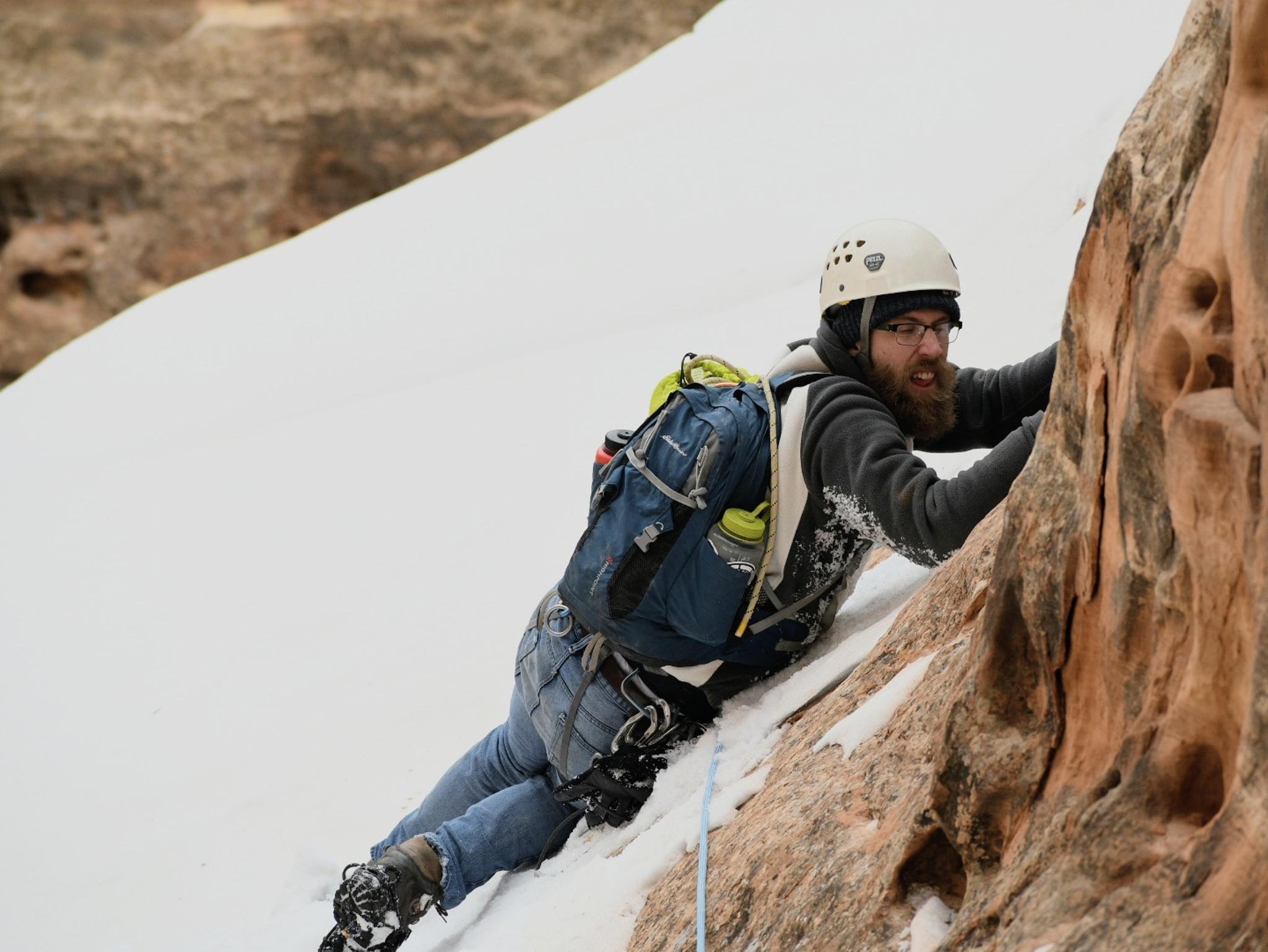 What the traverse to the second rappel looks when snow covered. It was extremely slick. You can see the rope that I'm being belayed on.