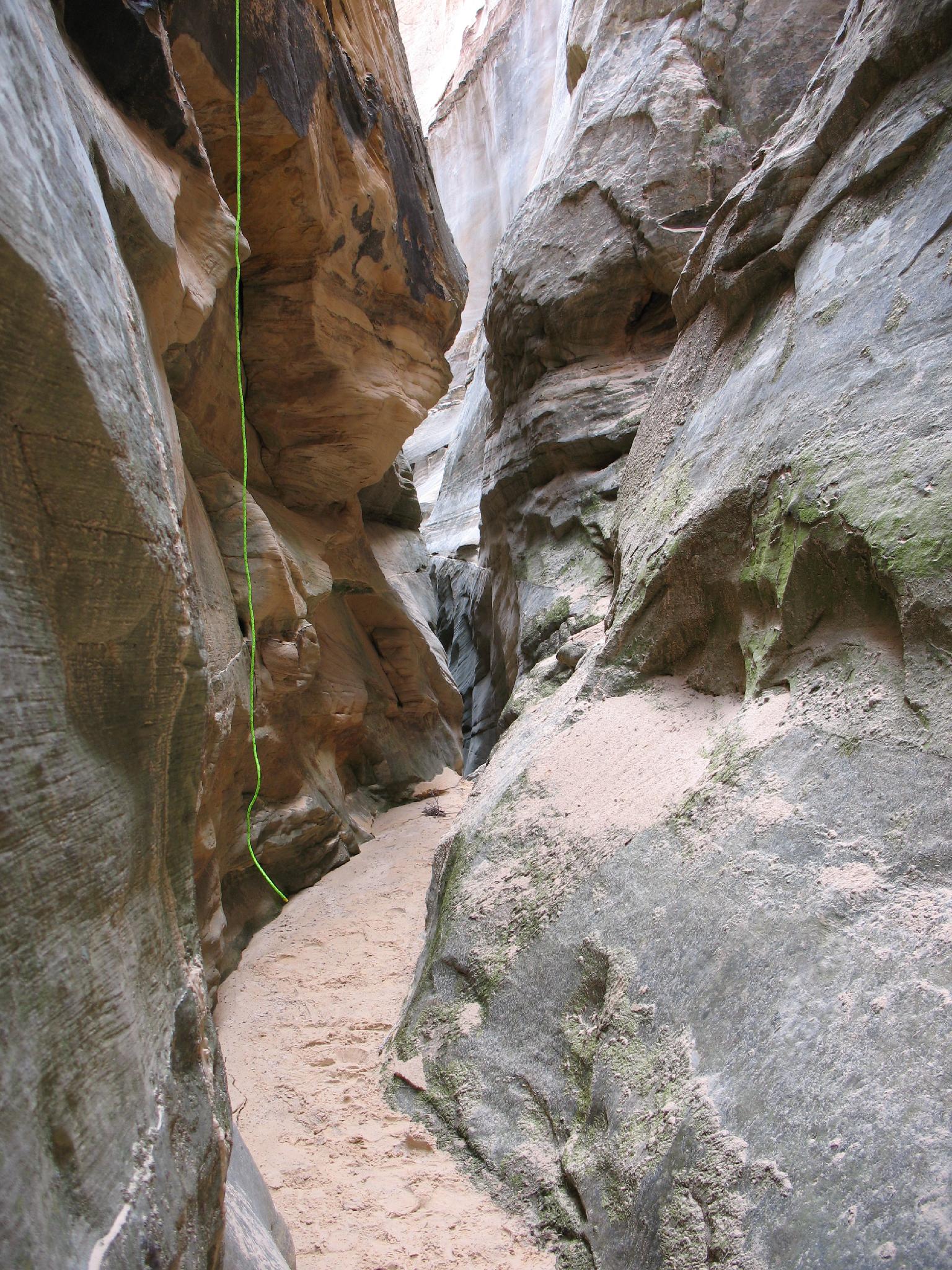Shortly below the rappel, BEFORE it gets narrow.