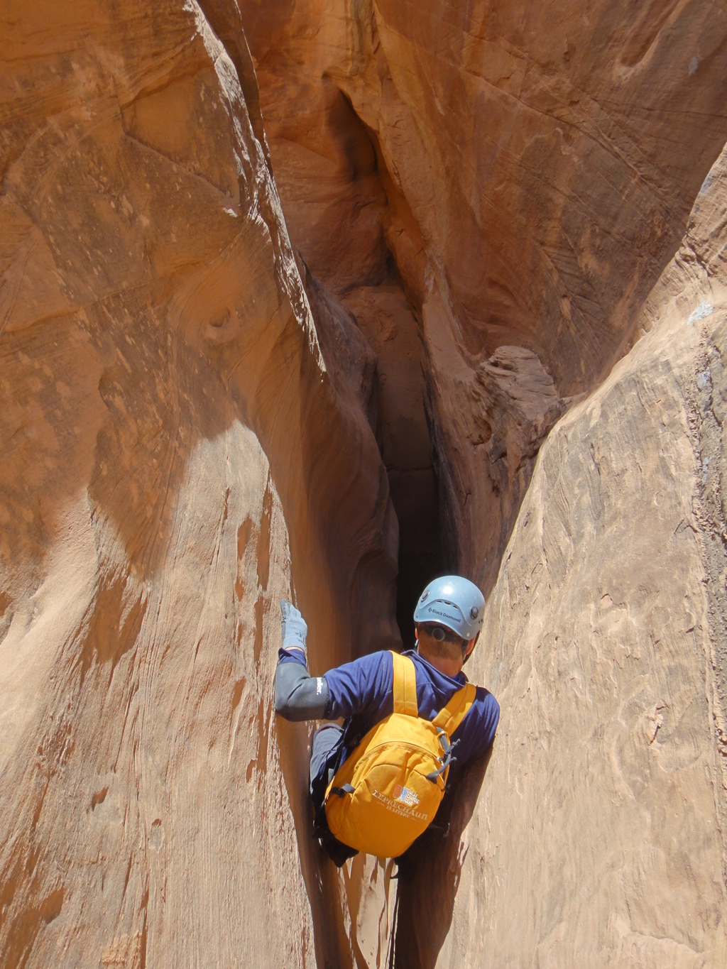 Andy downclimbing upper section - Inferno