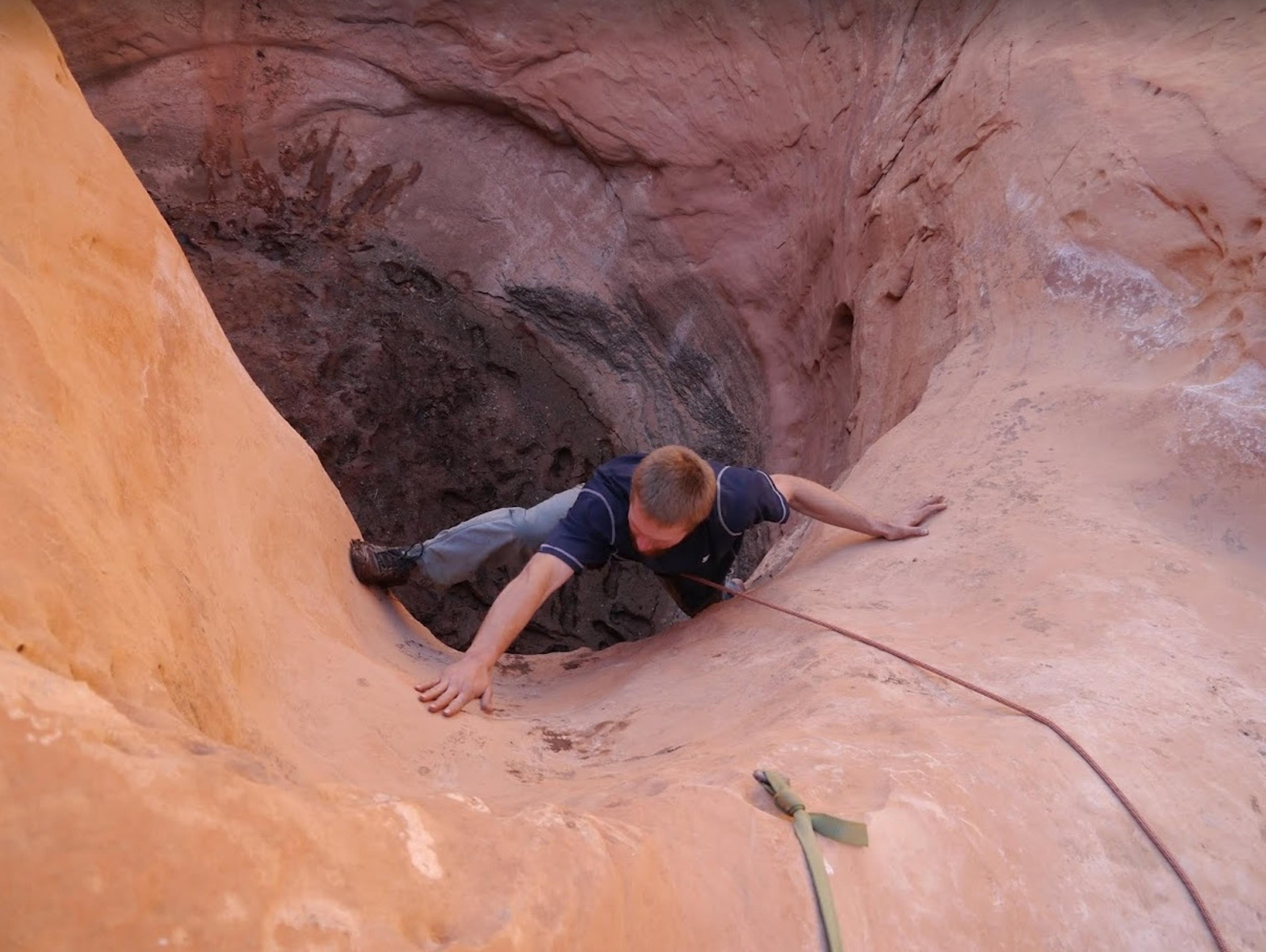 Climbing up out of the "keeper pothole" on toprope. The anchor sling was key for me to use to top it out as the first one up
