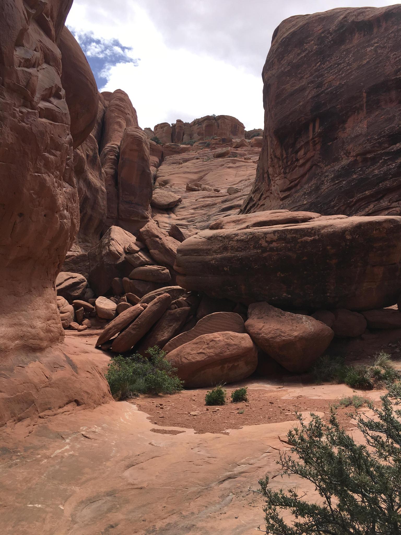 Boulder scramble to start the route to the summit after 1st rappel