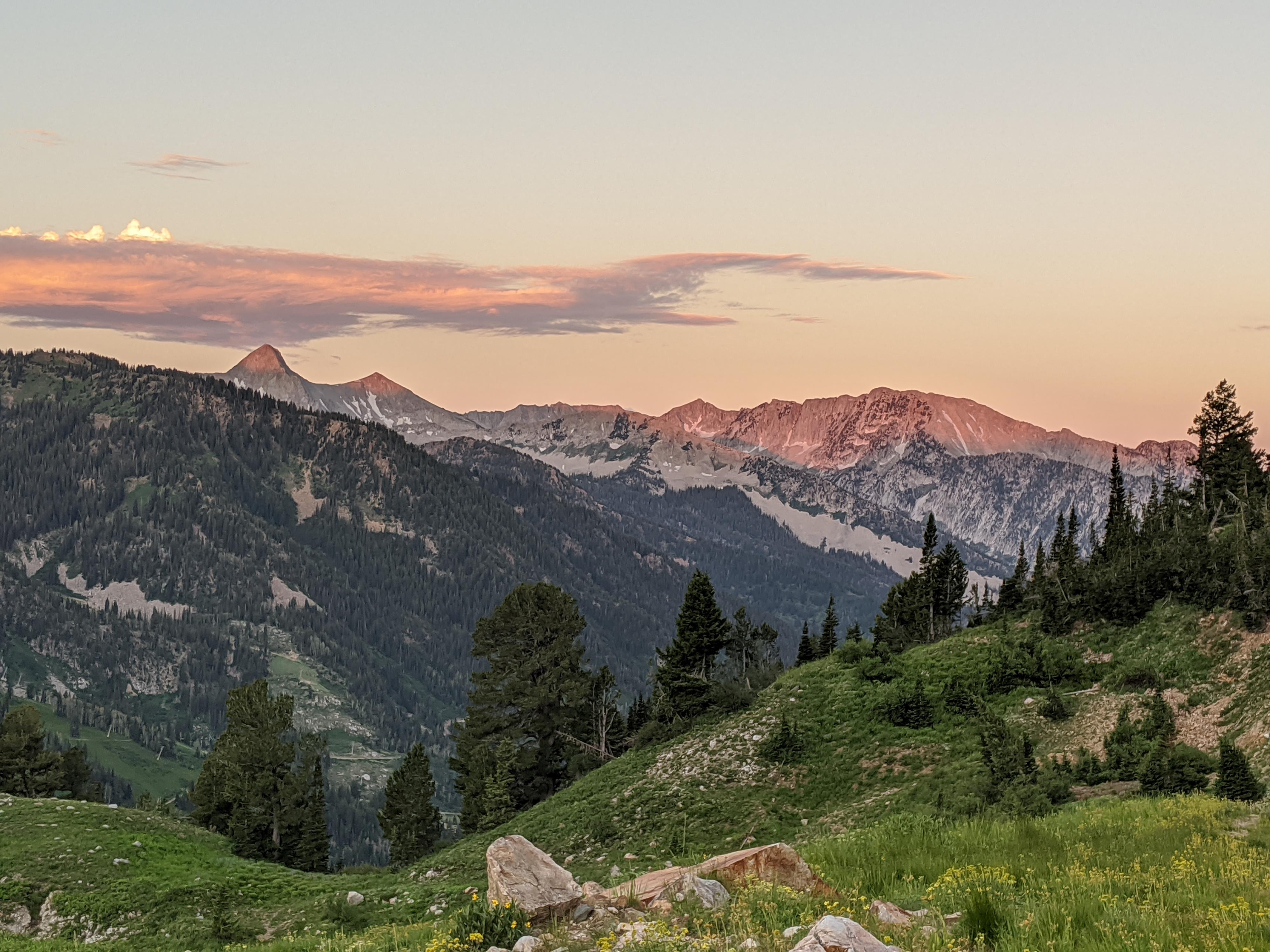 Dawn along the trail, lighting up the peaks on the north side of LCC.
