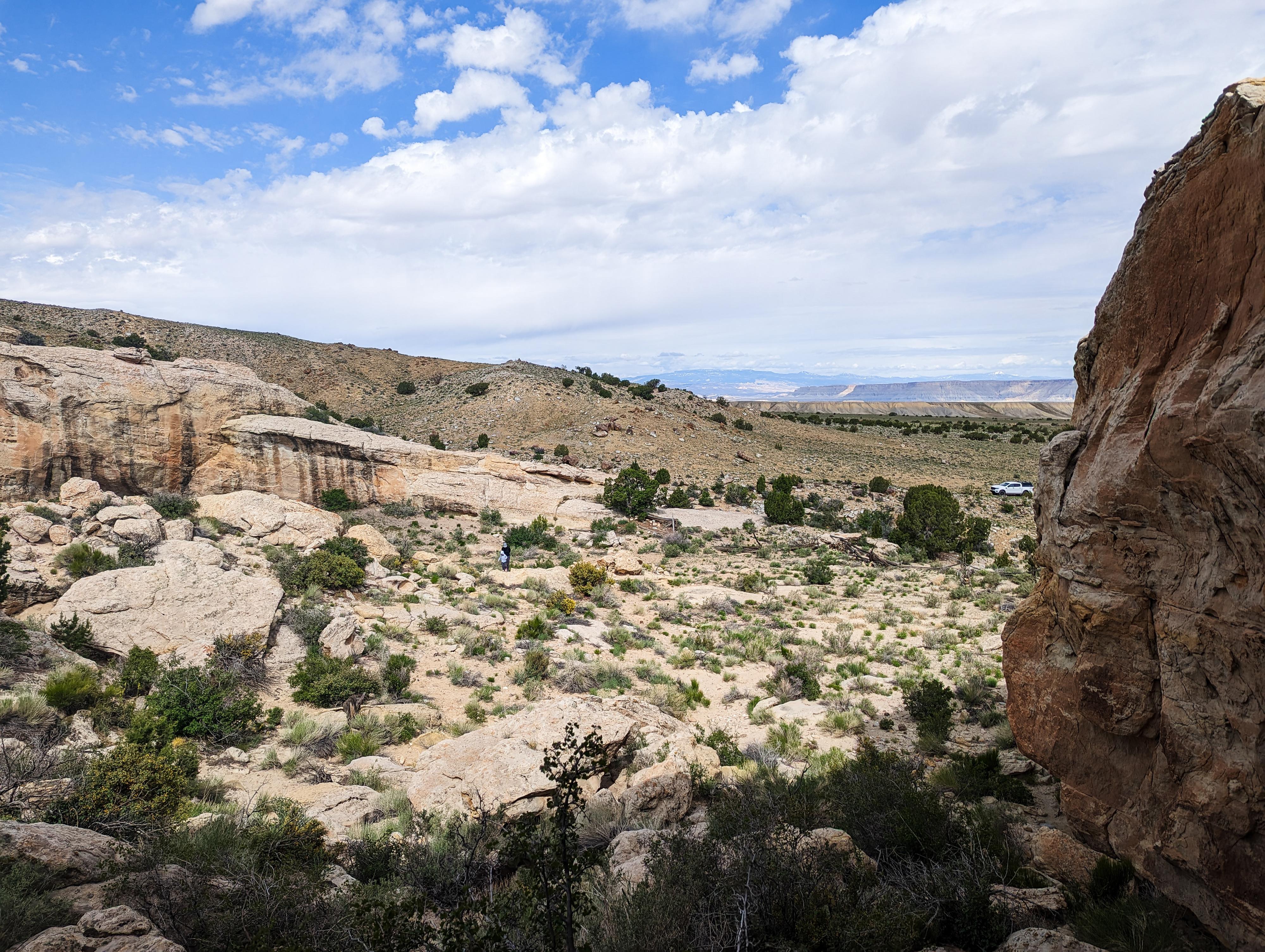 Looking back at the trailhead from the rock art site at the Rock Corral.