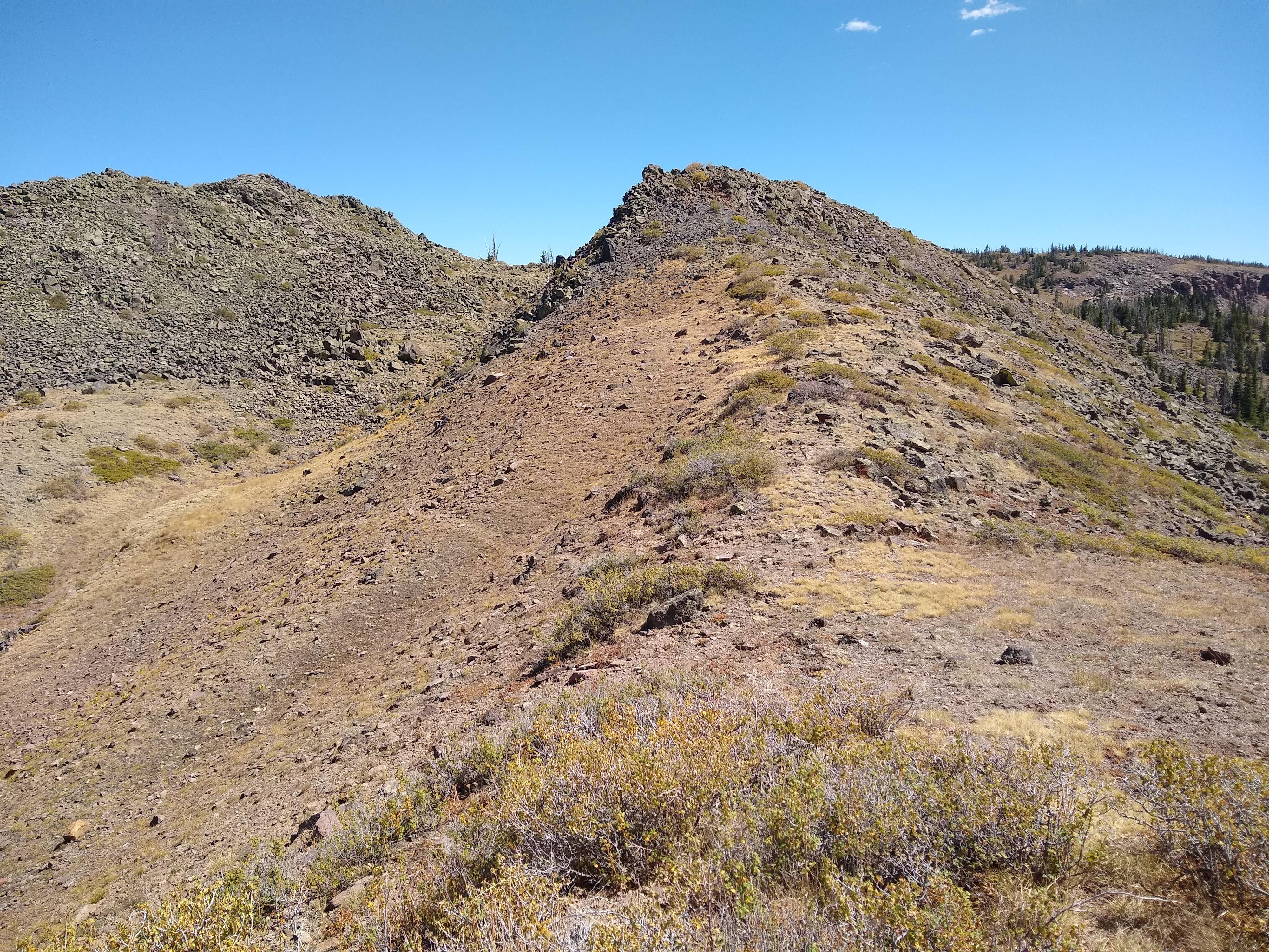 The route heads left off the ridgeline along a trail to the base of the rocky gully.