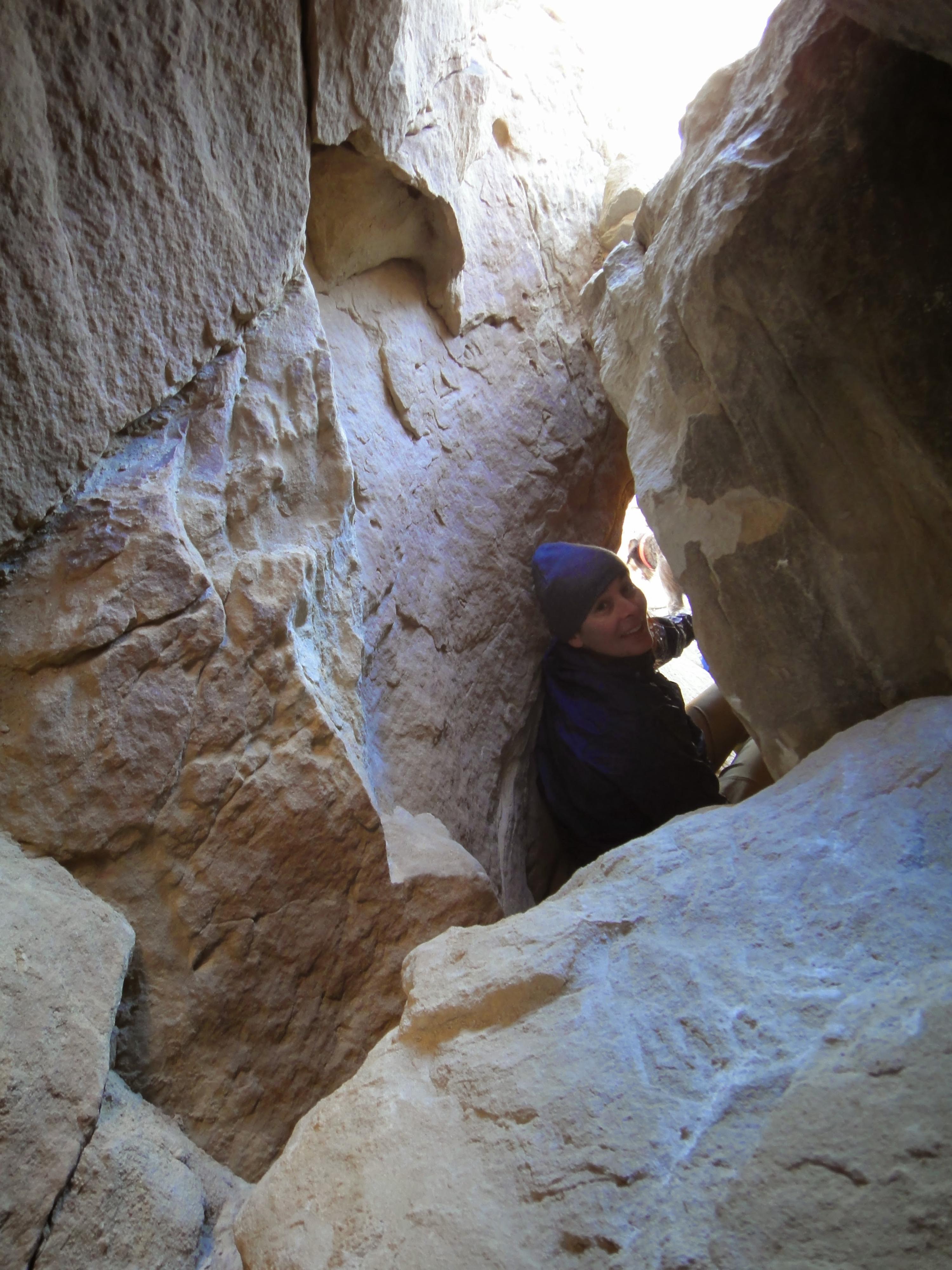 Cristina squeezing through the tight spot on the way back down.