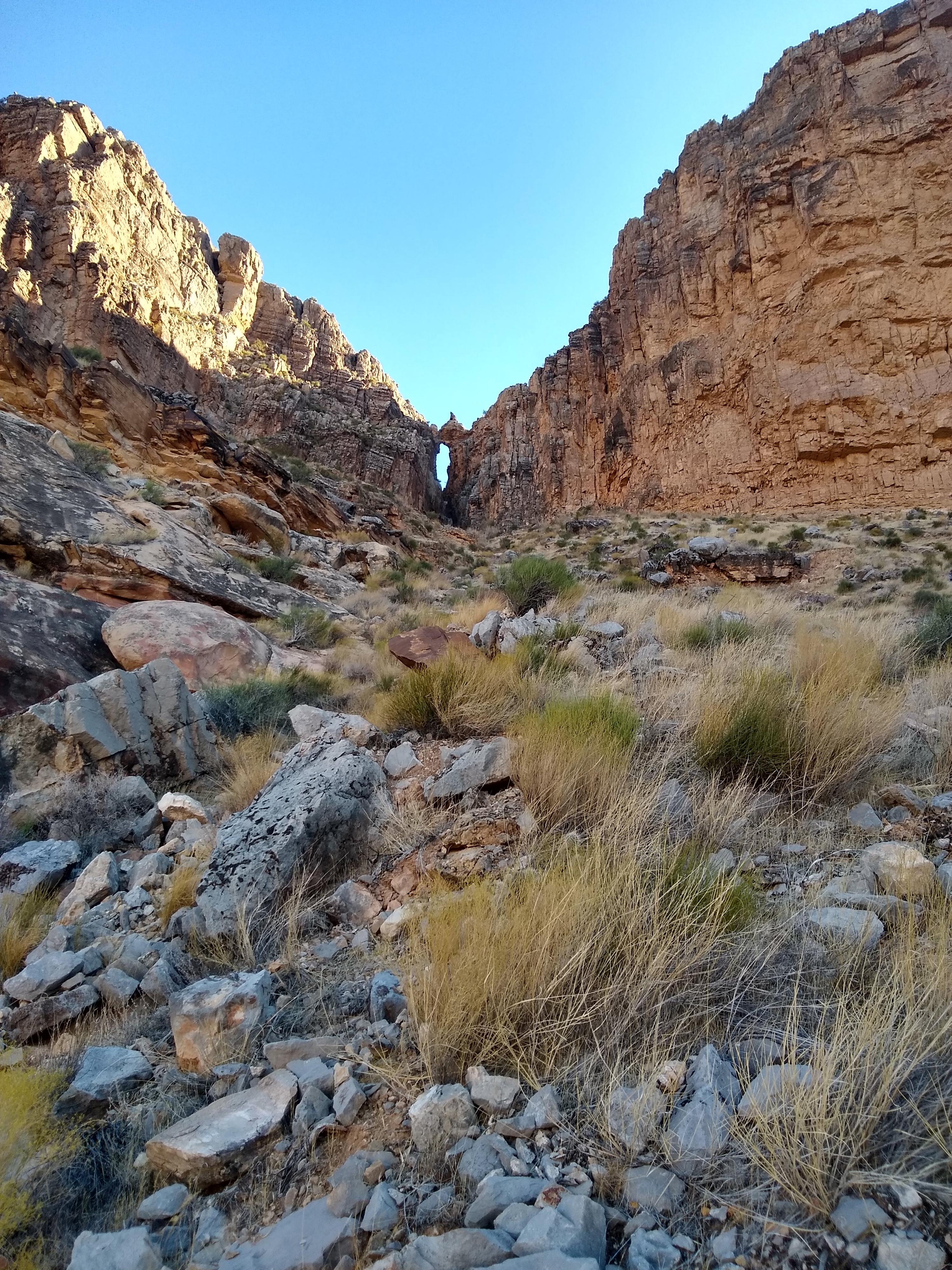 The gully narrowing toward the arch.