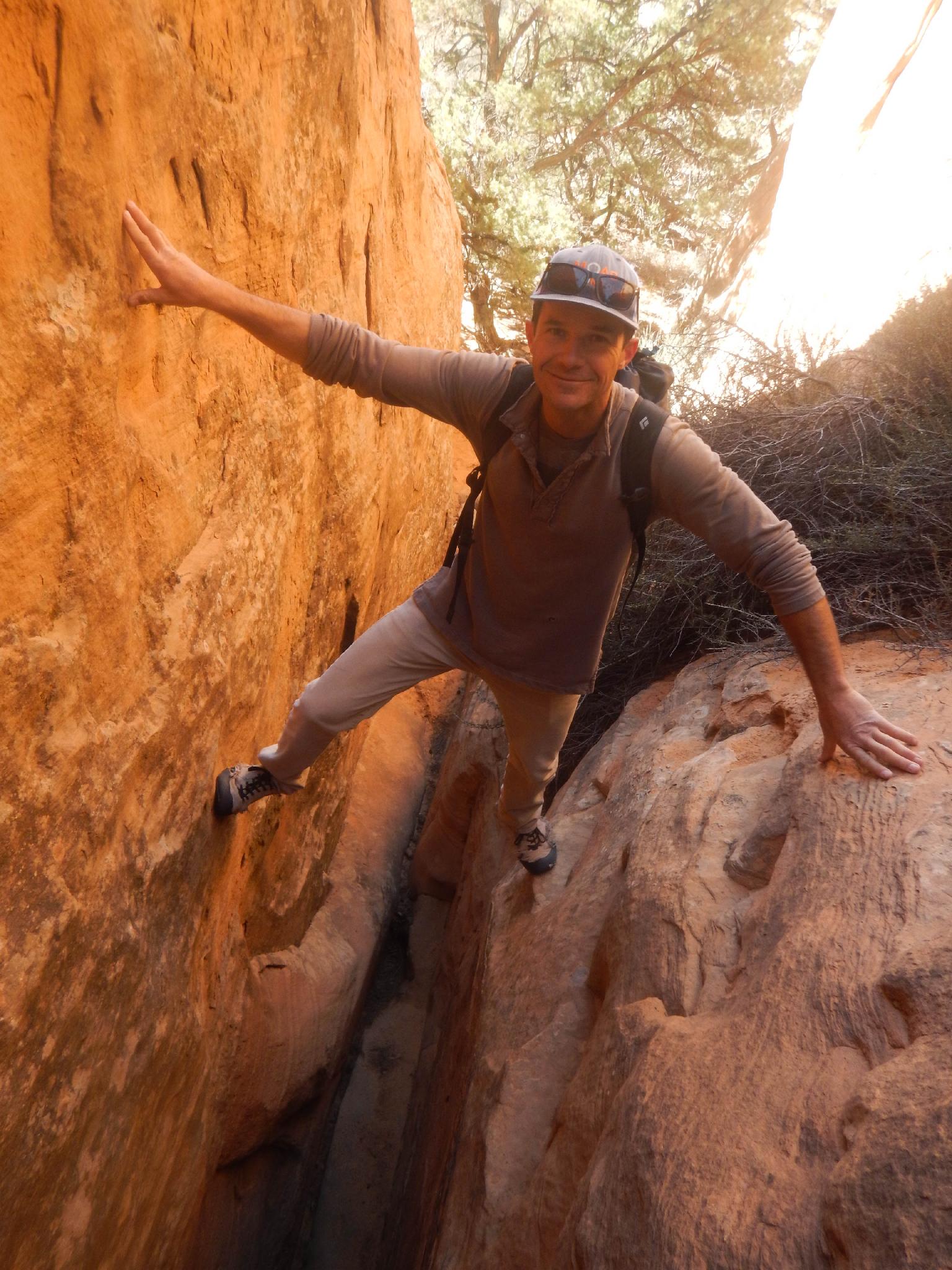 Jake chimneying up between the domes on the approach.