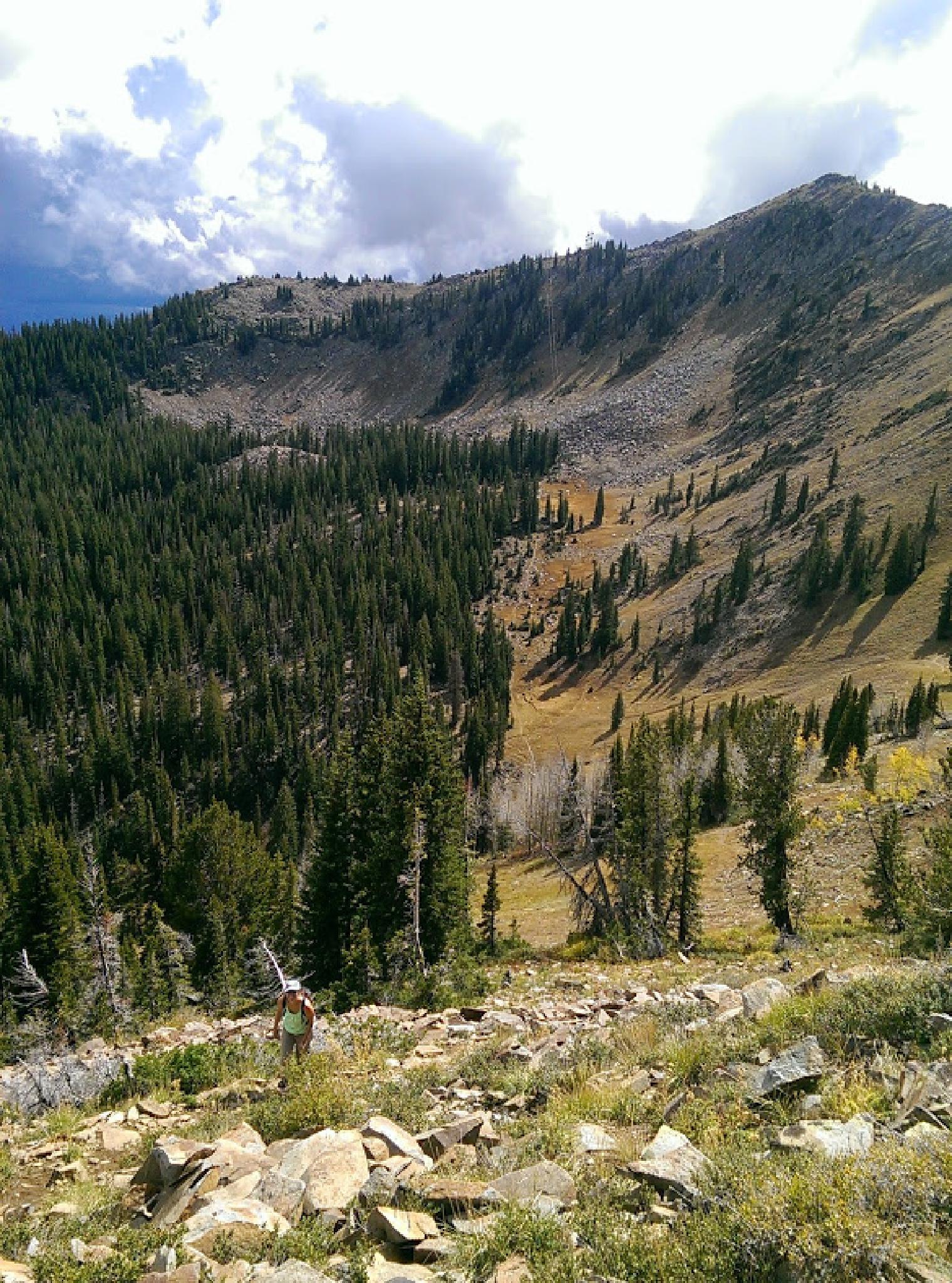 The lake is off the ridge in the center, below the talus hidden by the trees.