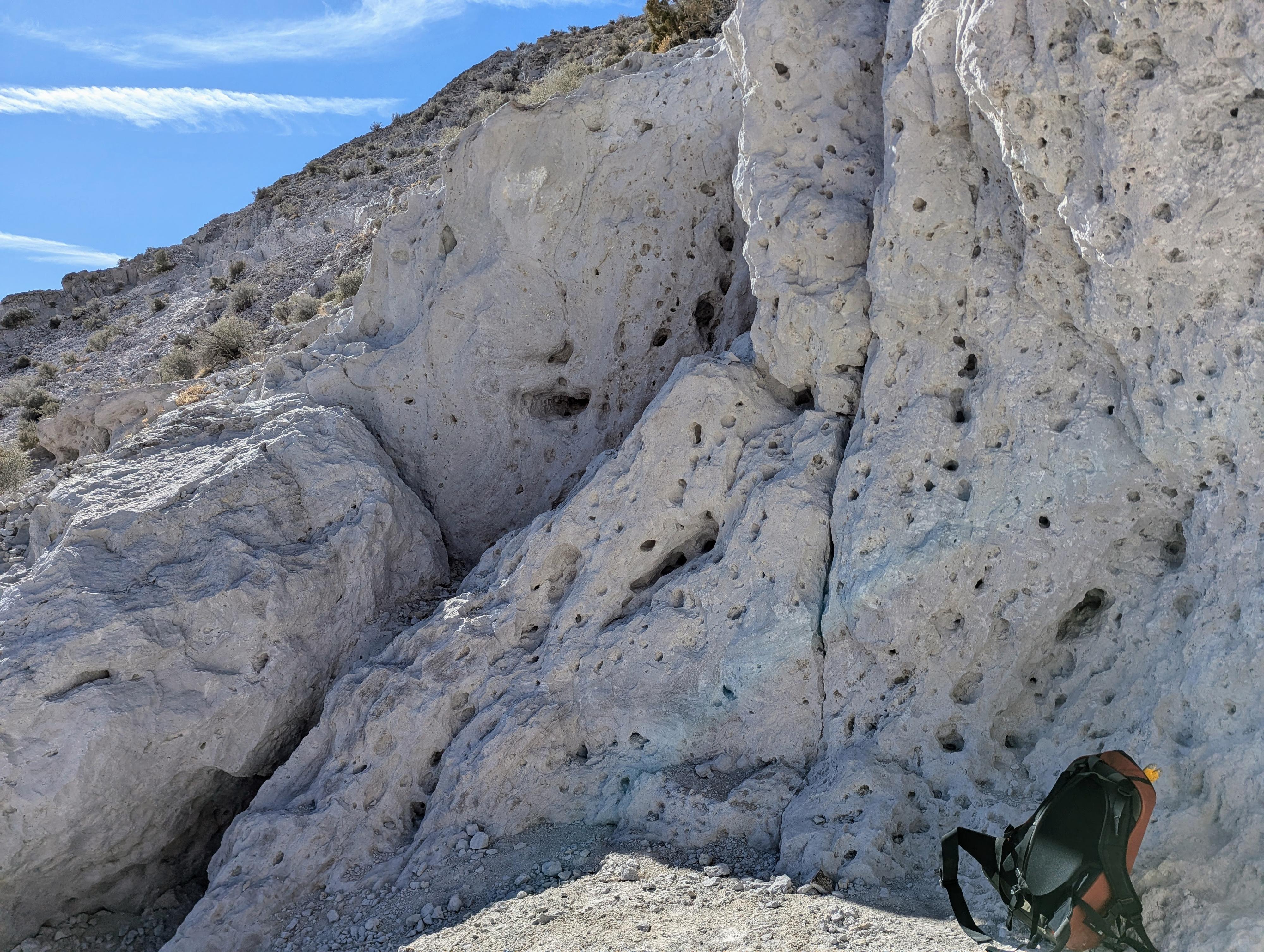 An area where people have been chiseling into weak spots in the rock.