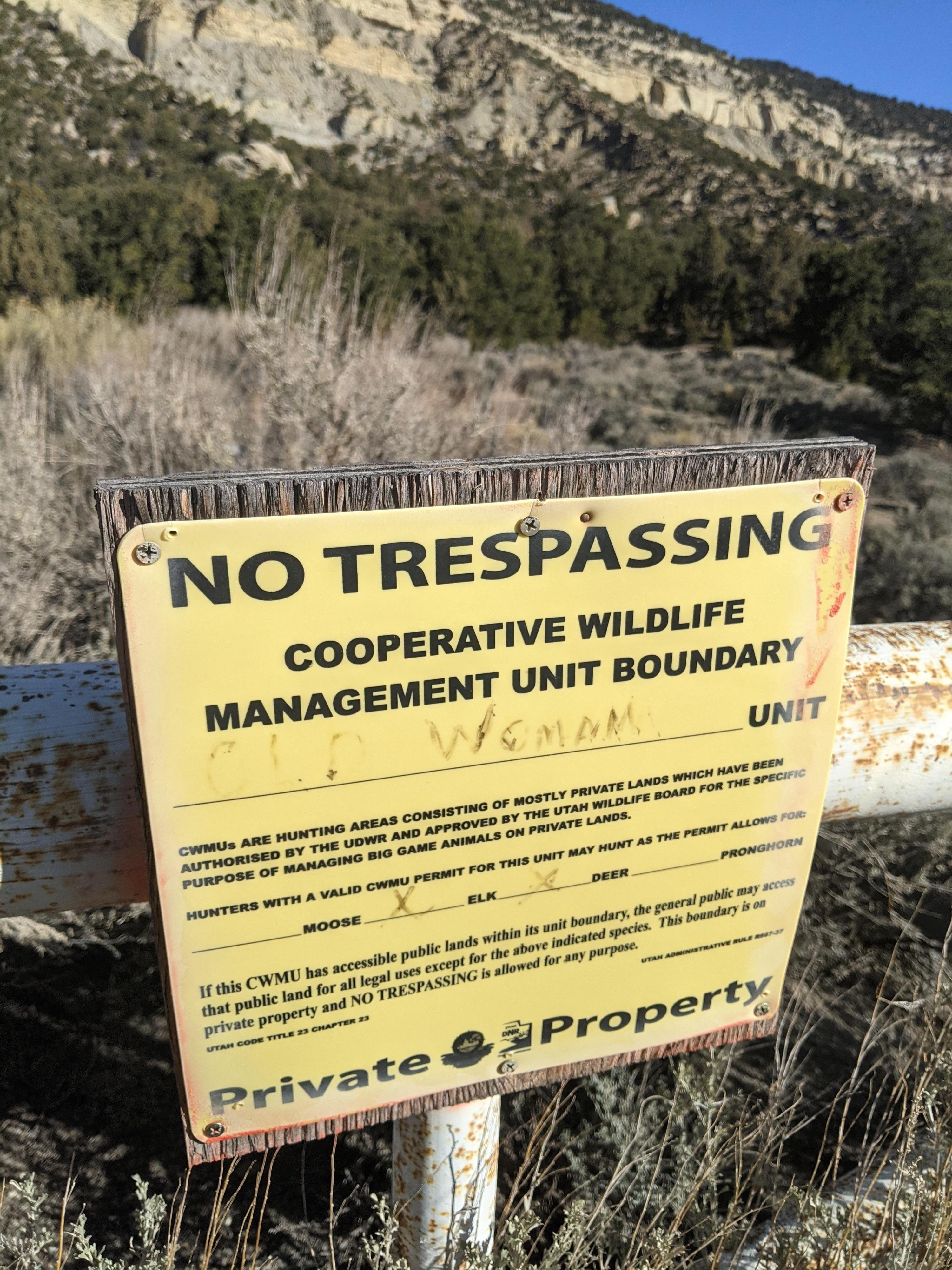 The sign at the gate. It is public land until past the panel where it becomes private.