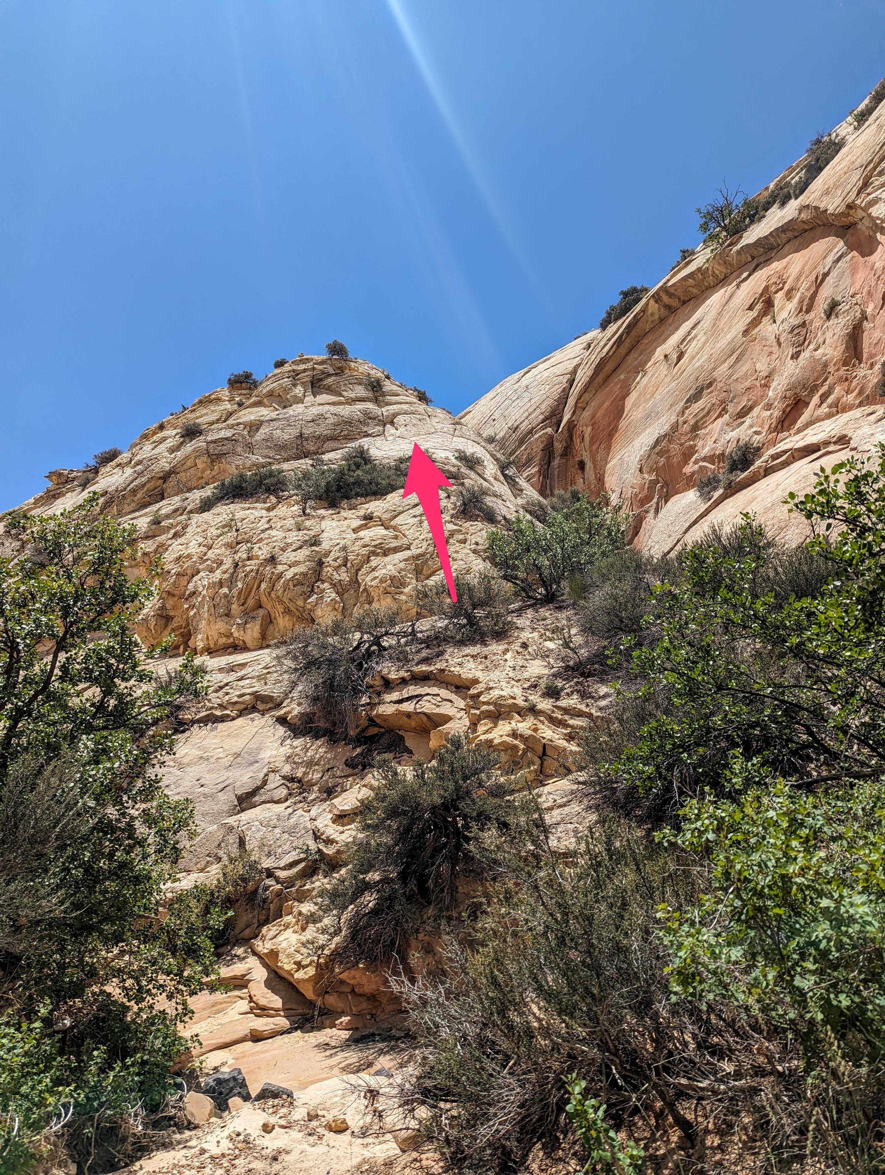 Exit. Just above the point of the arrow was the move or two of climbing. It seemed the easiest route.