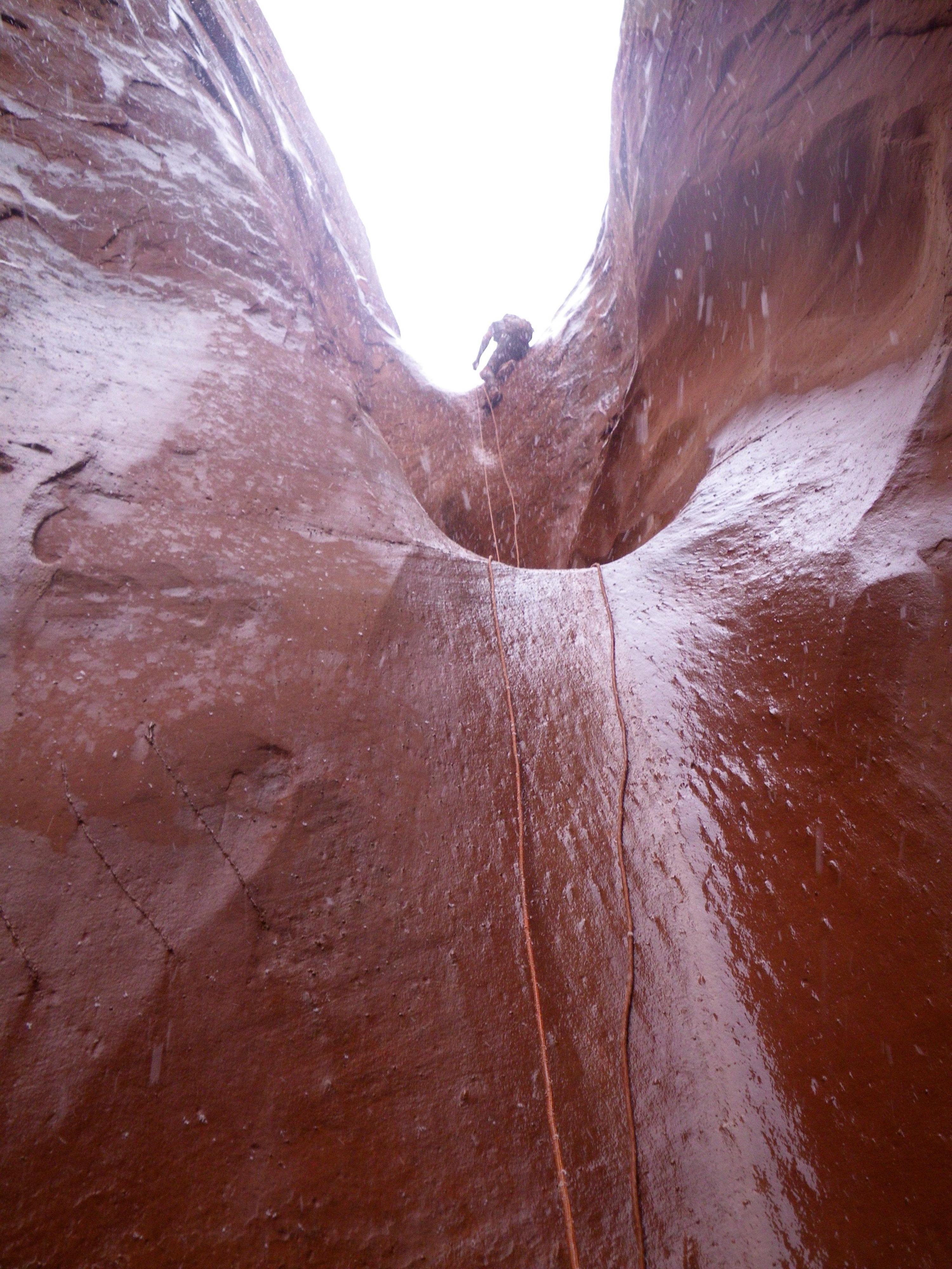 Mike Munger rappelling No Kidding as the rain turned to snow, February 2010. Photo Steve Levin.