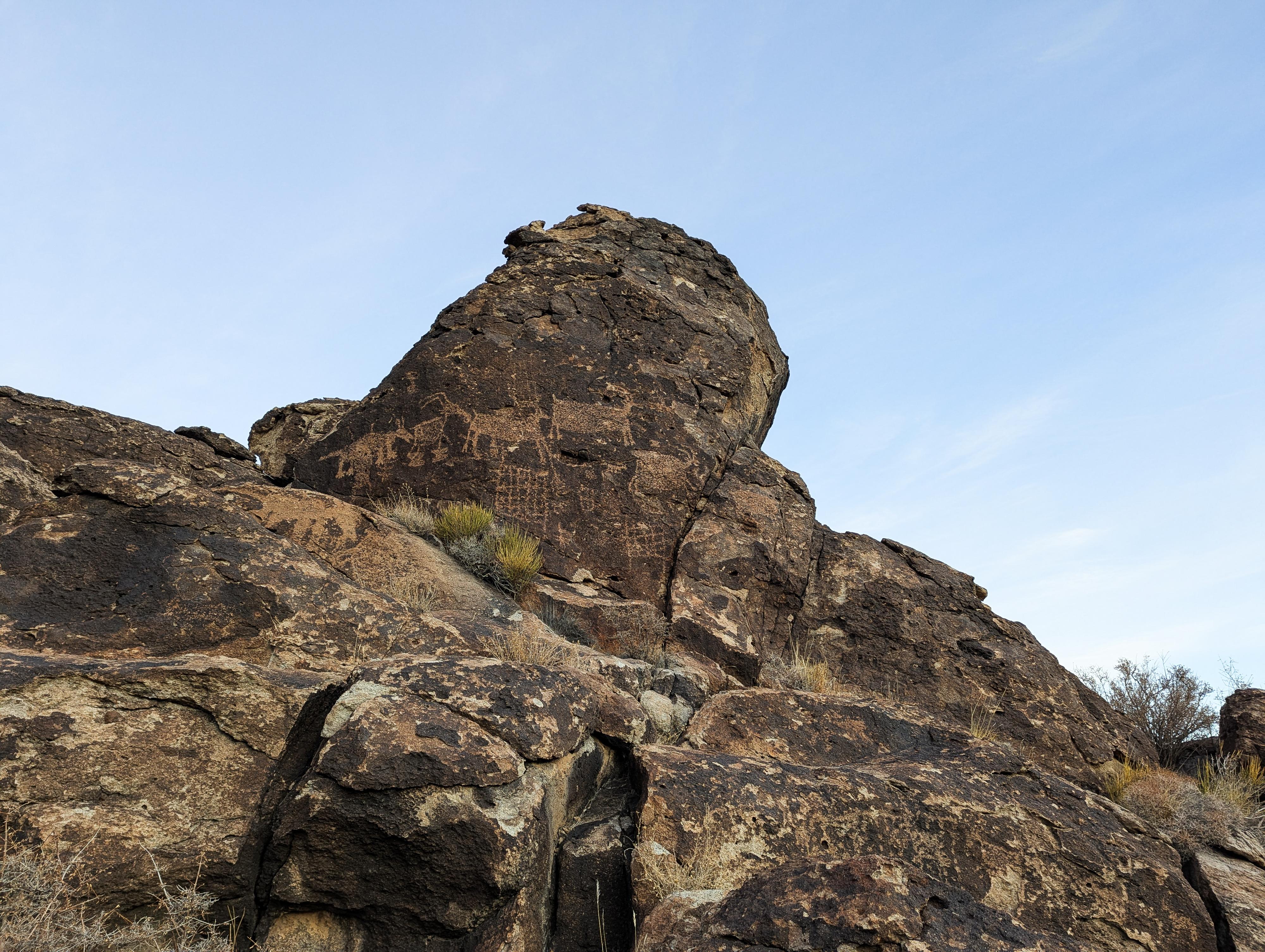 Three sheep on a high boulder at the final Rock Art site north of the corral.