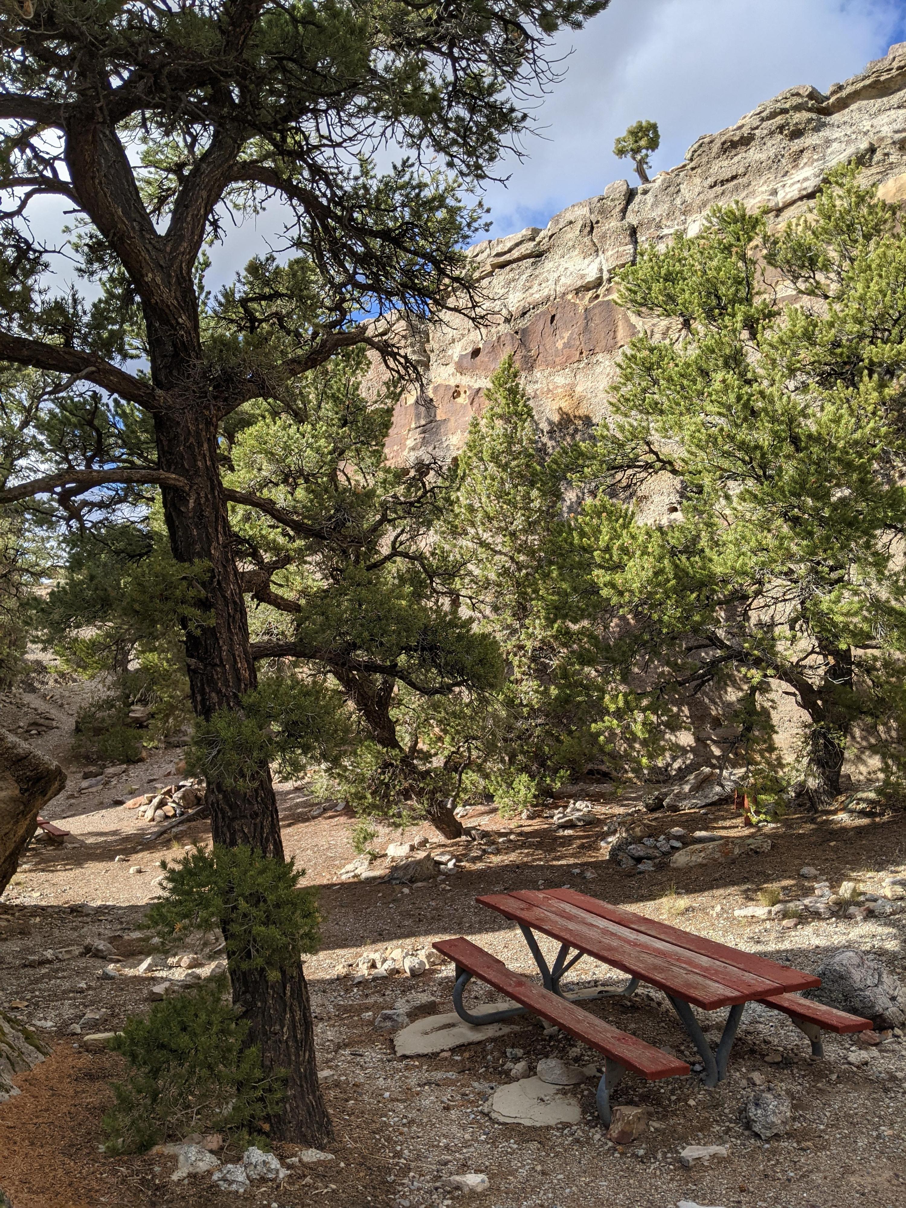 Picnic table amongst the trees and boulders.